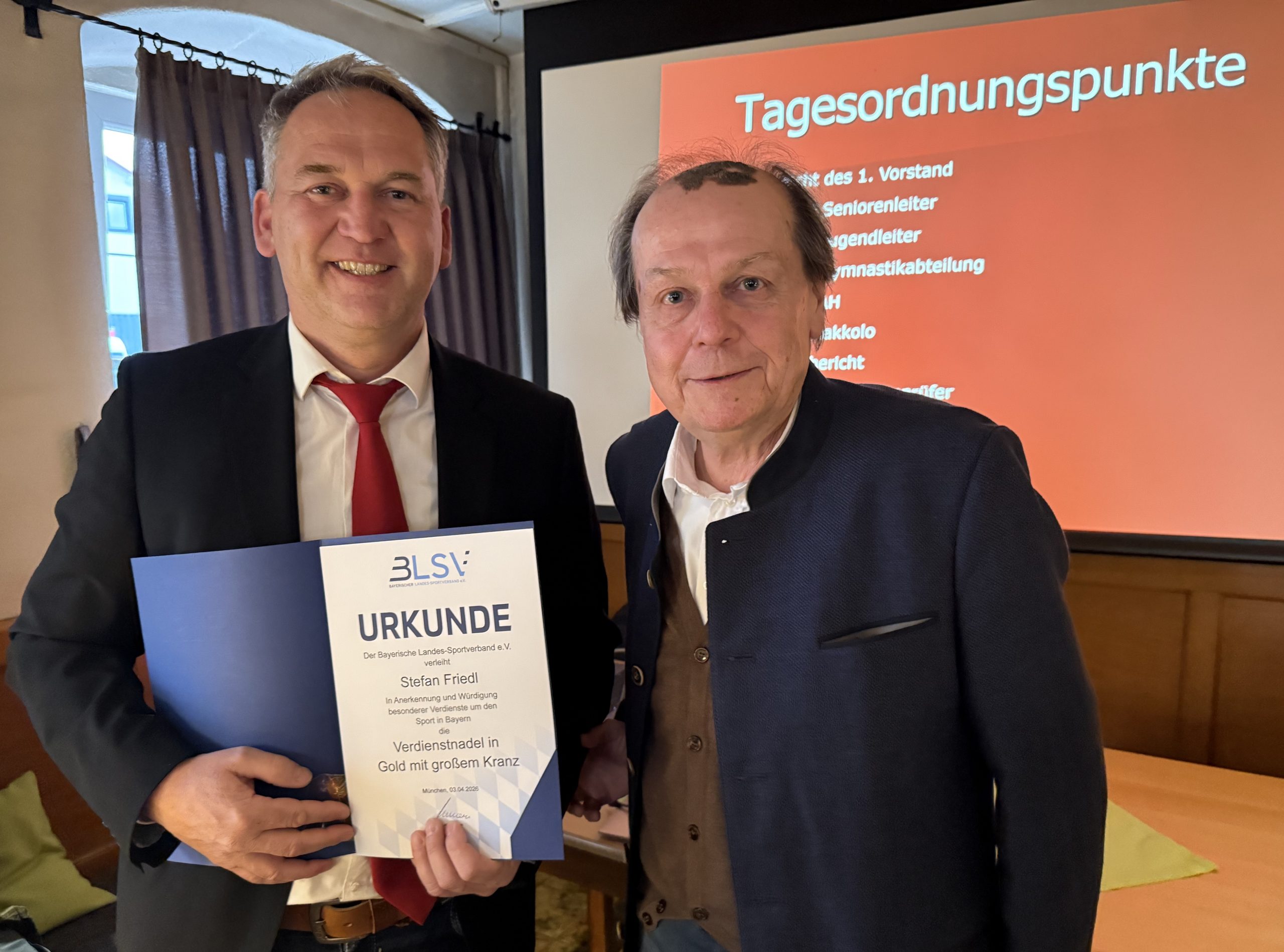 BCU-Vorsitzender Stefan Friedl (links) erhielt von BLSV-Kreisvorsitzendem Harald Bruckmeier (rechts) die Verdienstnadel in Gold mit großem Kranz und Urkunde für 35-jährige ehrenamtliche Vereinstätigkeit.
